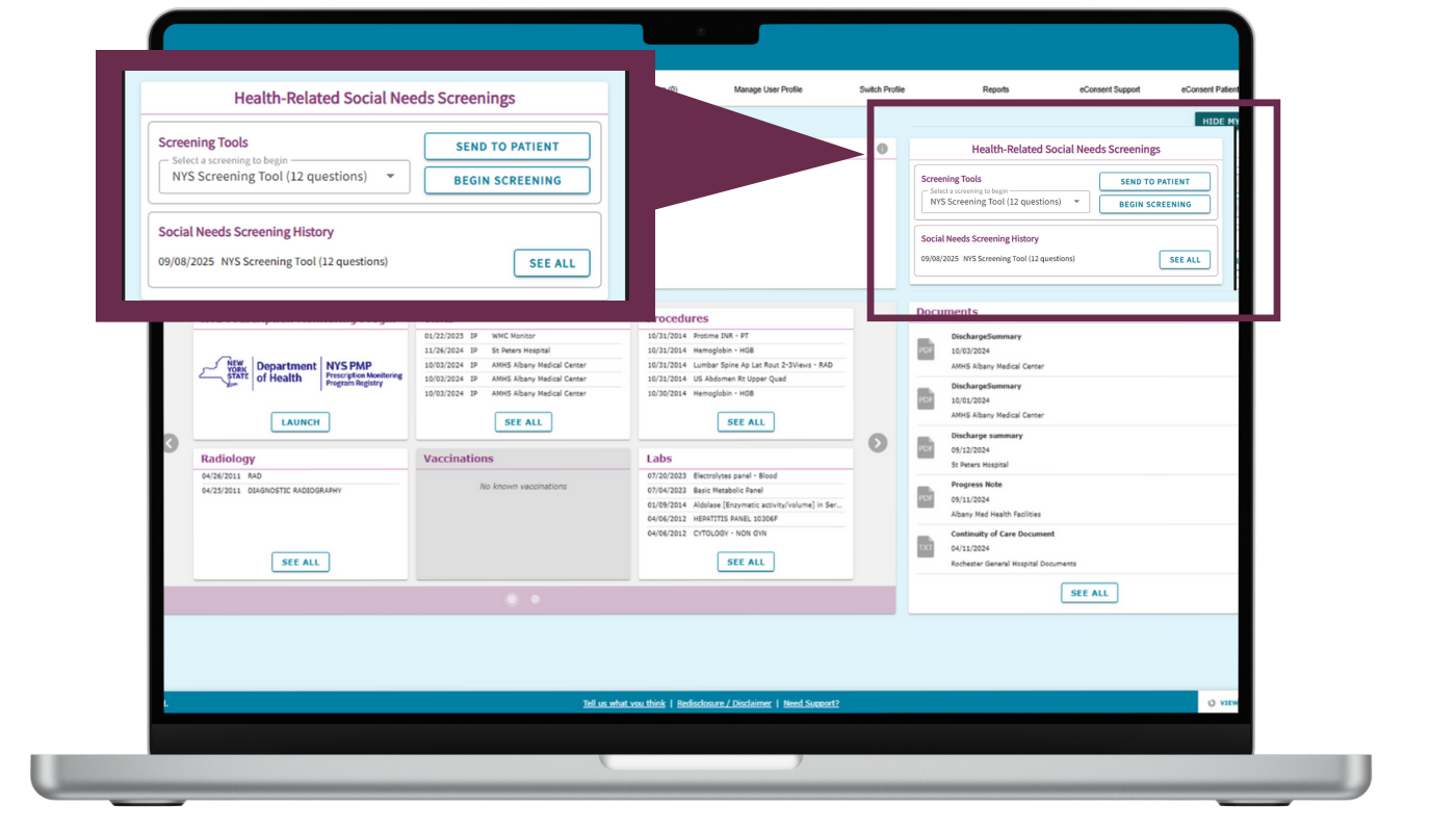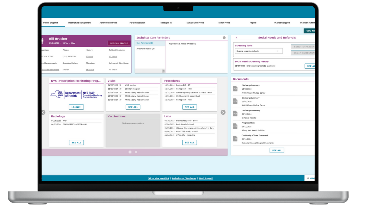 With Hixny, you gain access to an organized view of patient data, access to statewide resources, and state-approved tools to improve patient health outcomes all in one place, all within your EHR.