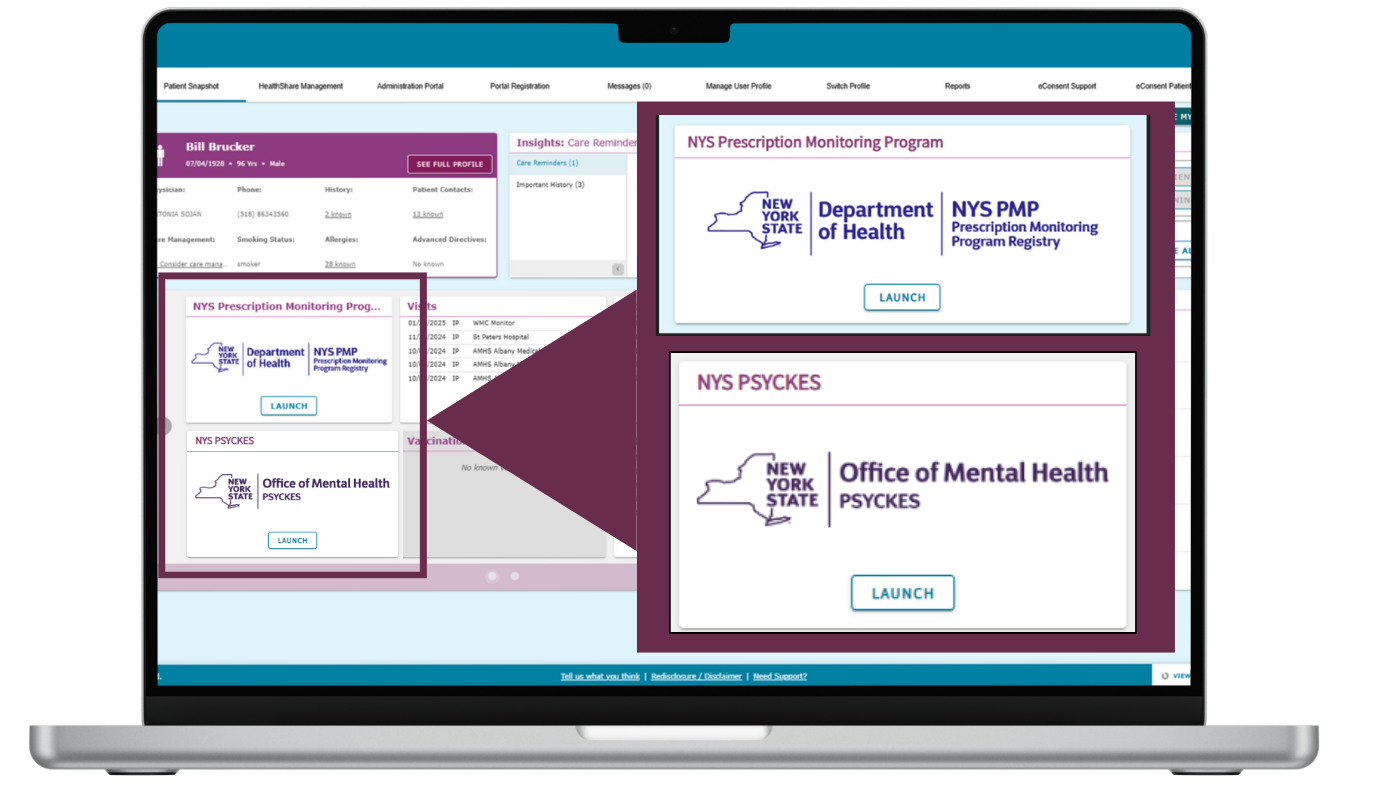 • One-click access to DOH's prescription monitoring program query tool and OMH's PSYCKES behavioral health database