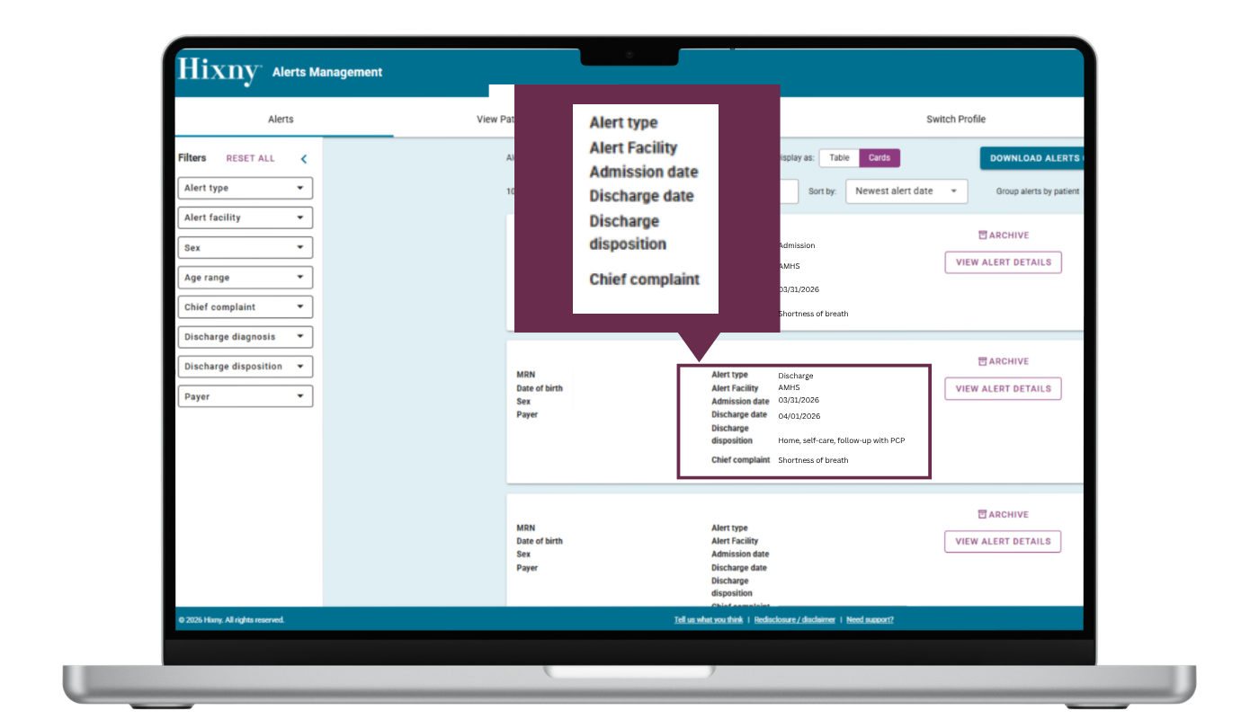 When chief complaint, discharge diagnoses and discharge disposition are available, they are shared directly in the ADT alert you receive from us.